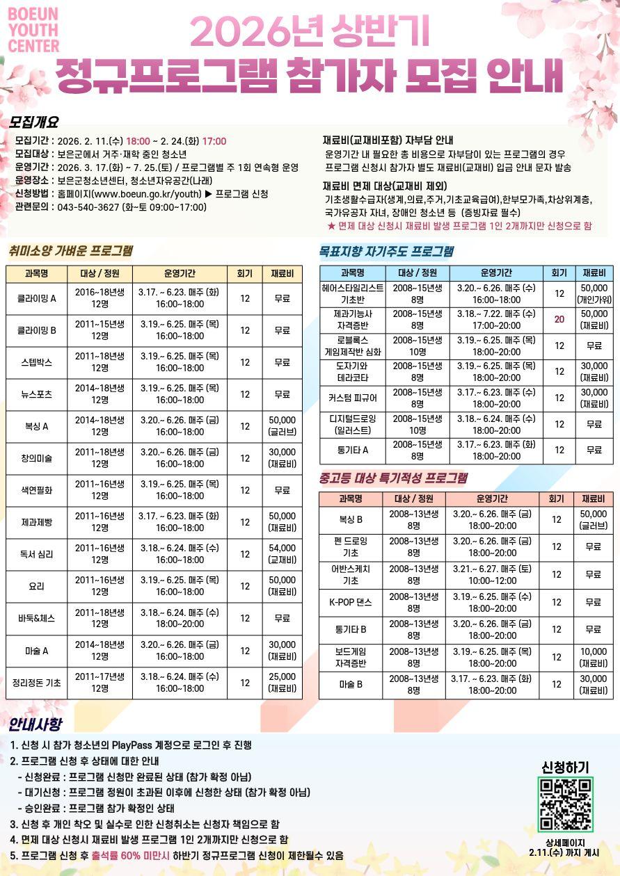 2026년 상반기정규프로그램(3~6월) 운영 안내드립니다.